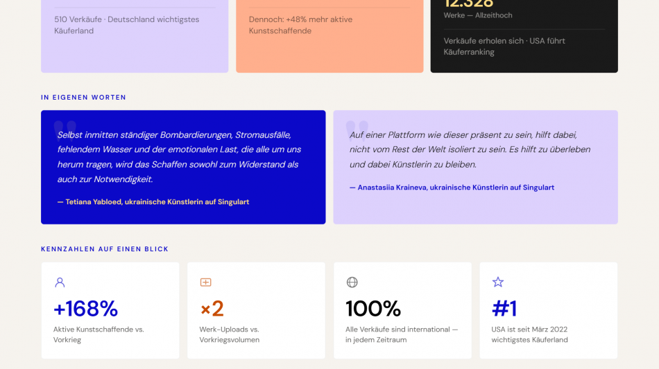 Zwischen März und Dezember 2022 waren die Auswirkungen unmittelbar und messbar. Die Verkäufe von Werken ukrainischer Künstler auf der Plattform gingen um 68 % zurück, und die Zahl der hochgeladenen Kunstwerke sank um 65 %. Dennoch stieg im selben Zeitraum die Zahl der aktiven Künstler um 48 %. Die Künstler warteten nicht darauf, dass sich die Bedingungen verbesserten, sondern nahmen ihr Schicksal selbst in die Hand.